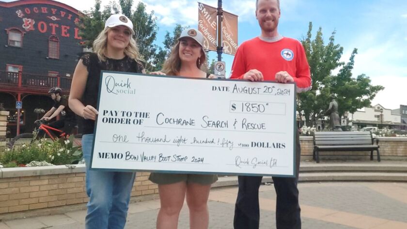 With the inaugural Bow Valley Boot Stomp now in the books, organizer of the event, Quirk Social, handed off a hefty $1,850 donation to Cochrane Search and Rescue (CSAR) on Aug. 20.